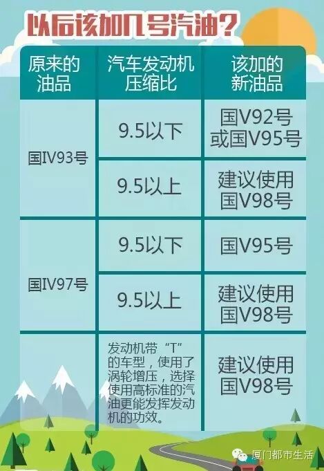 原来加93号汽油的车主,以后加92号汽油即可,原来加97号汽油的车主,今后可加95号汽油,车主应该根据汽车说明书添加最适合的汽油。如果汽车发动机压缩比在9.5以上或是发动机带涡轮增压的车辆,最好使用98号汽油,这样更能发挥发动机的功效。