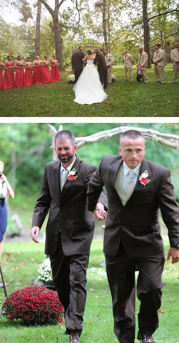 14、新娘的爸爸在婚礼时邀请新娘的继父上台。