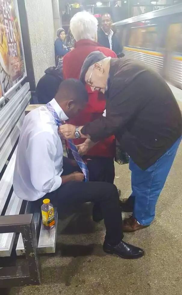 19、地铁站,一位着急面试的年轻人怎么也弄不好自己的领带,这时一位老人走过去帮他整理。