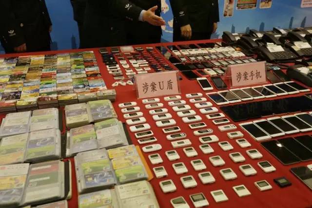 涉案电话机、手机、U盾、伪基站配件、银行卡等在发布会现场展示。